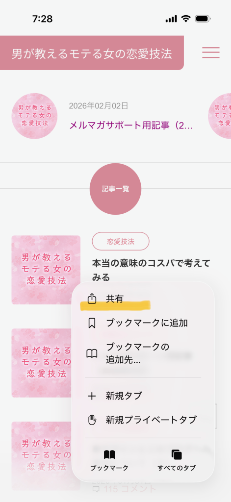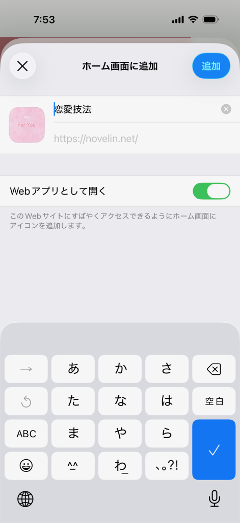 もちろんそのまま登録してもらってもいいのですが、ホーム画面で見づらいと思いますので、「恋愛技法」とか「技法ブログ」とかに短縮した方がいいかなと思います。