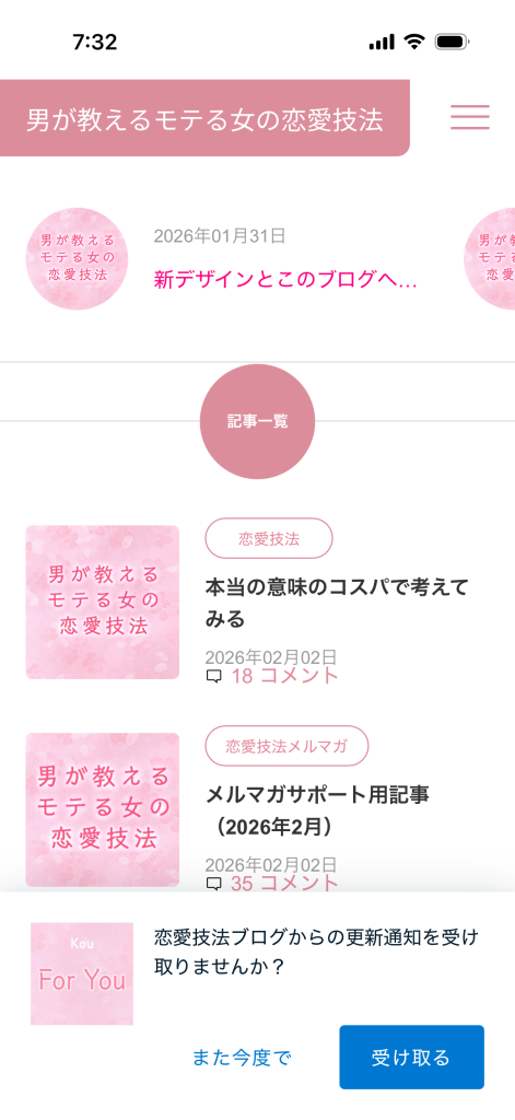 これは任意ですが、アプリを開いたらブログが表示され、通知を受け取るかどうかを聞いてきますので、ぜひ「受け取る」を選んでもらえればと思います(^^